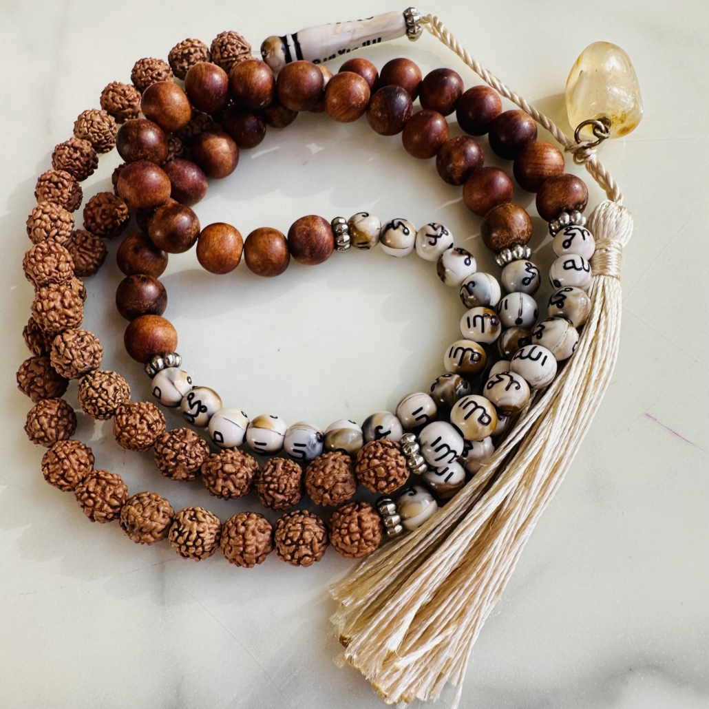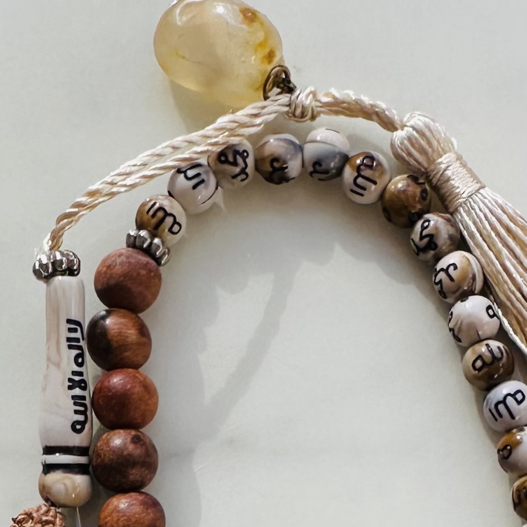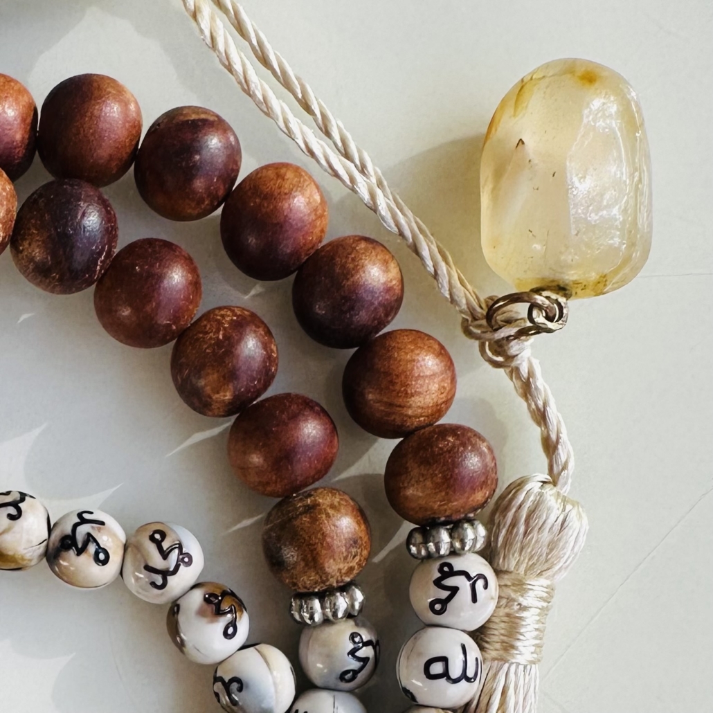 Chapelet Compose de Graine de Rudraksha, de Boules de bois de Tuya et de nom d’Allah le tout puissant avec une terminaison de Pierre de Cornaline light. Parfait a offrir!